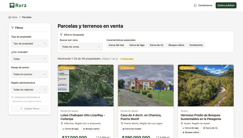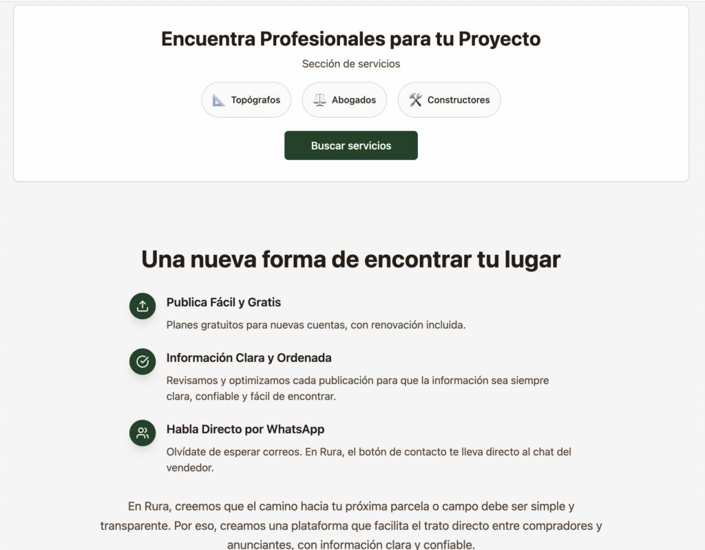 Rura no solo permite publicar y buscar terrenos en todo Chile, sino que también incorpora una sección de corredores y servicios, generando una red que facilita el proceso completo de compra y venta.